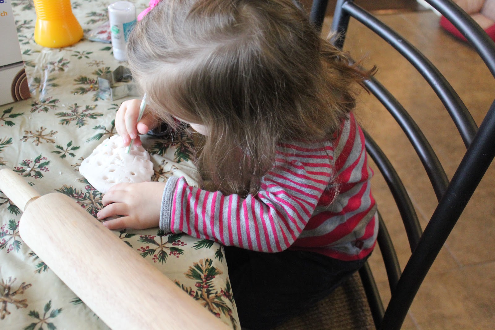 On Tuesday we got up and as soon as Daddy left for work, we started making clay ornaments. Here is the recipe we used for the ornaments: Clay Christmas Decorations. This was also a very easy recipe, but I would caution anyone to be careful you do not cook it too long or the dough becomes very crumbly, which makes it more difficult to work with and makes a huge mess. I'm all about messy crafts, but it sure helps when I'm mentally prepared for the mess. I really wasn't thinking today's activity would be a big mess, but I was wrong! I even bought some sequins to use instead of glitter thinking that would also be less messy... once again I was wrong. We did end up having some fun together though and ended up with some really cute ornaments. If we do this one again next year I will be better prepared!